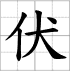 Grille d'écriture du caractère : - fú 伏 (Se pencher / s'incliner, se baisser / se cacher / avouer / canicule / volt)