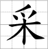Grille d'écriture du caractère : - cǎi 采 (Cueillir / saisir / tirer vers le bas / potentiel extensif)